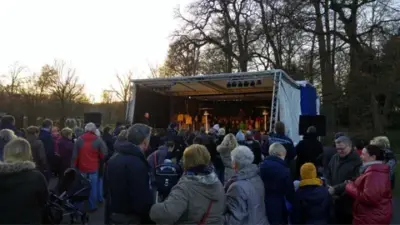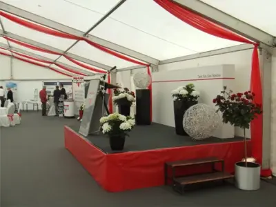 Die Bühnenplattform wird durch Podeste erstellt, der Aufbau erfolgt mittels Zeltkonstruktionen.