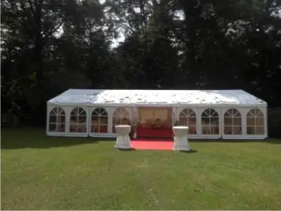 Das VIP-Zelt in 6m Grundbreite läßt sich in 3m – Schritten verlängern, wobei die kleinste zu bauende Größe