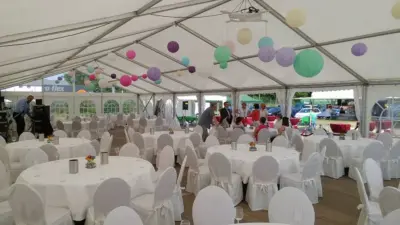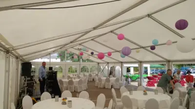 Das VIP-Zelt in 10m Grundbreite läßt sich in 3m – Schritten verlängern, wobei die kleinste zu bauende Größe