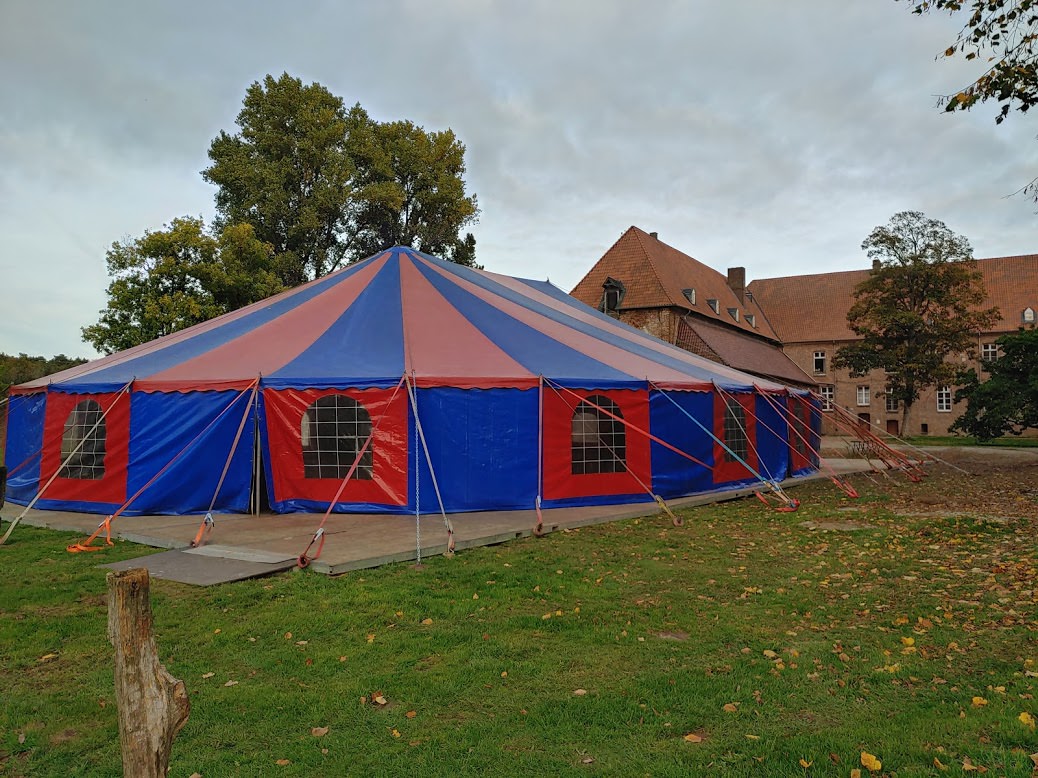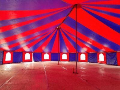 Unsere Zirkuszelte bestehen alle aus einer rot-blauen Dachplane, die durch zwei Masten und einer Quertraverse in der Mitte des Zeltes gehalten wird.